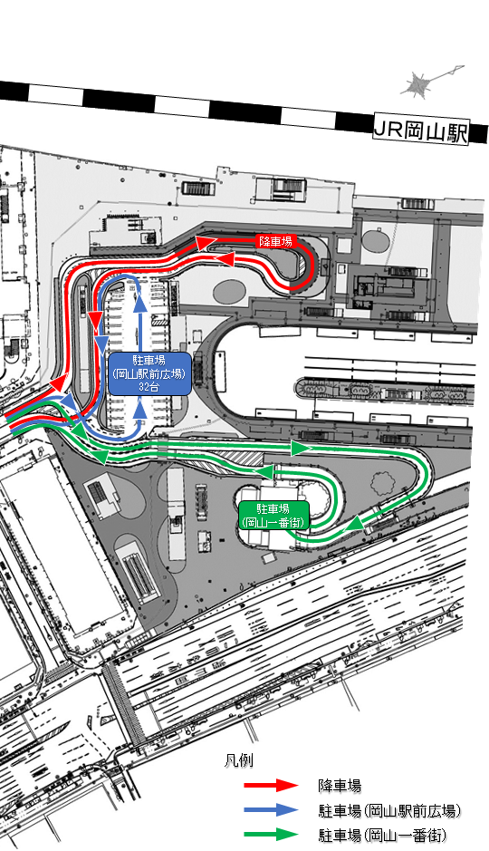 岡山駅へのお送り、お迎え、駐車は用途に応じて降車場、駐車場のご利用をお願いします。