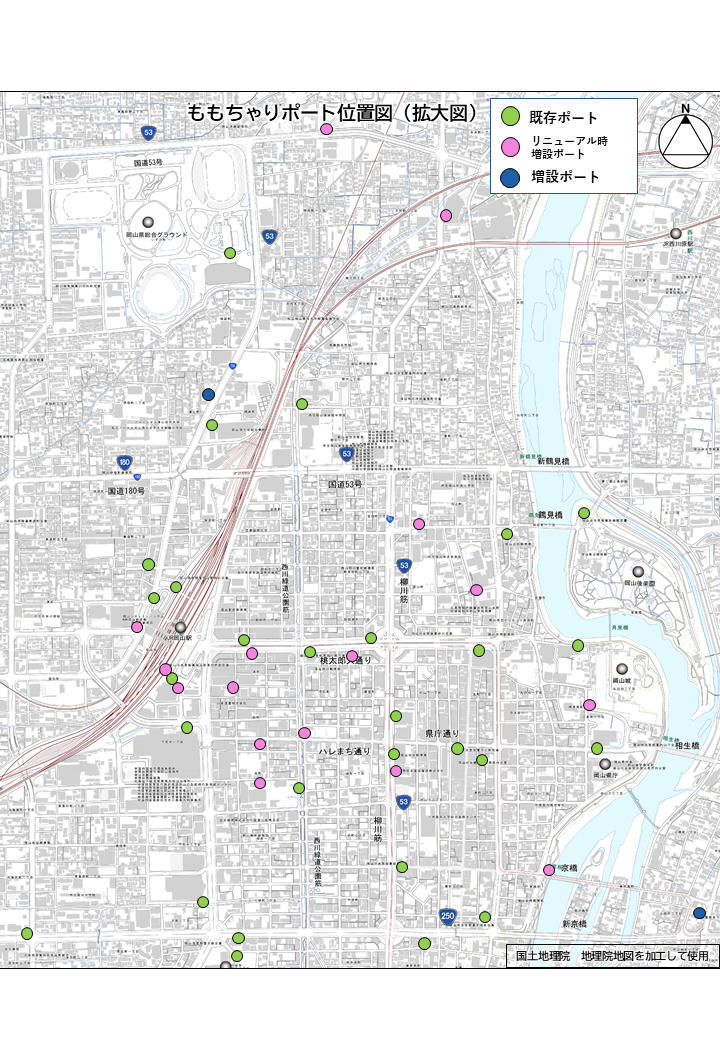 | 36 | 岡山駅東口(さんすて岡山南館前) | 76 | ローソン岡山大元店 ※4月24日(金曜日)17時頃~ |