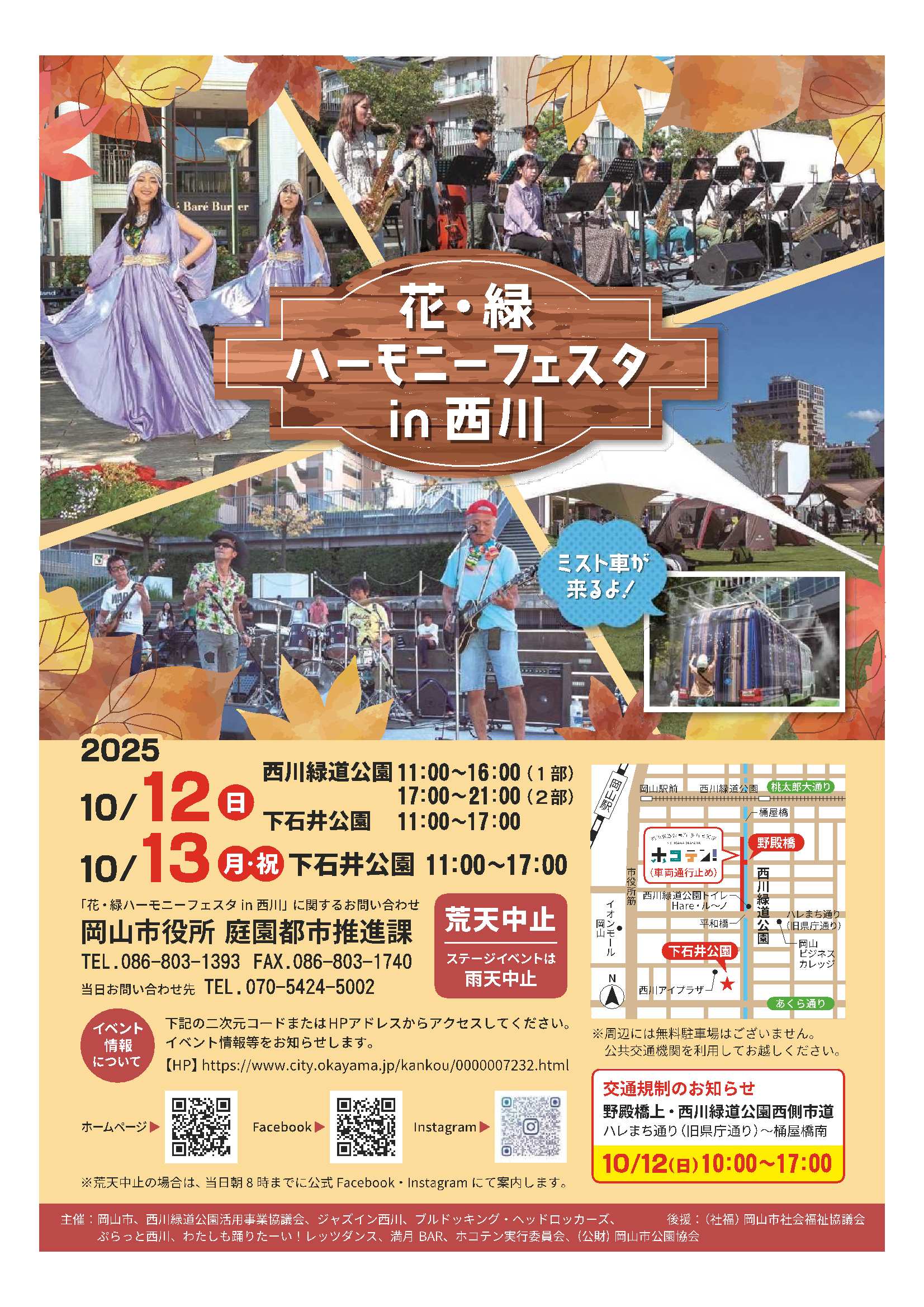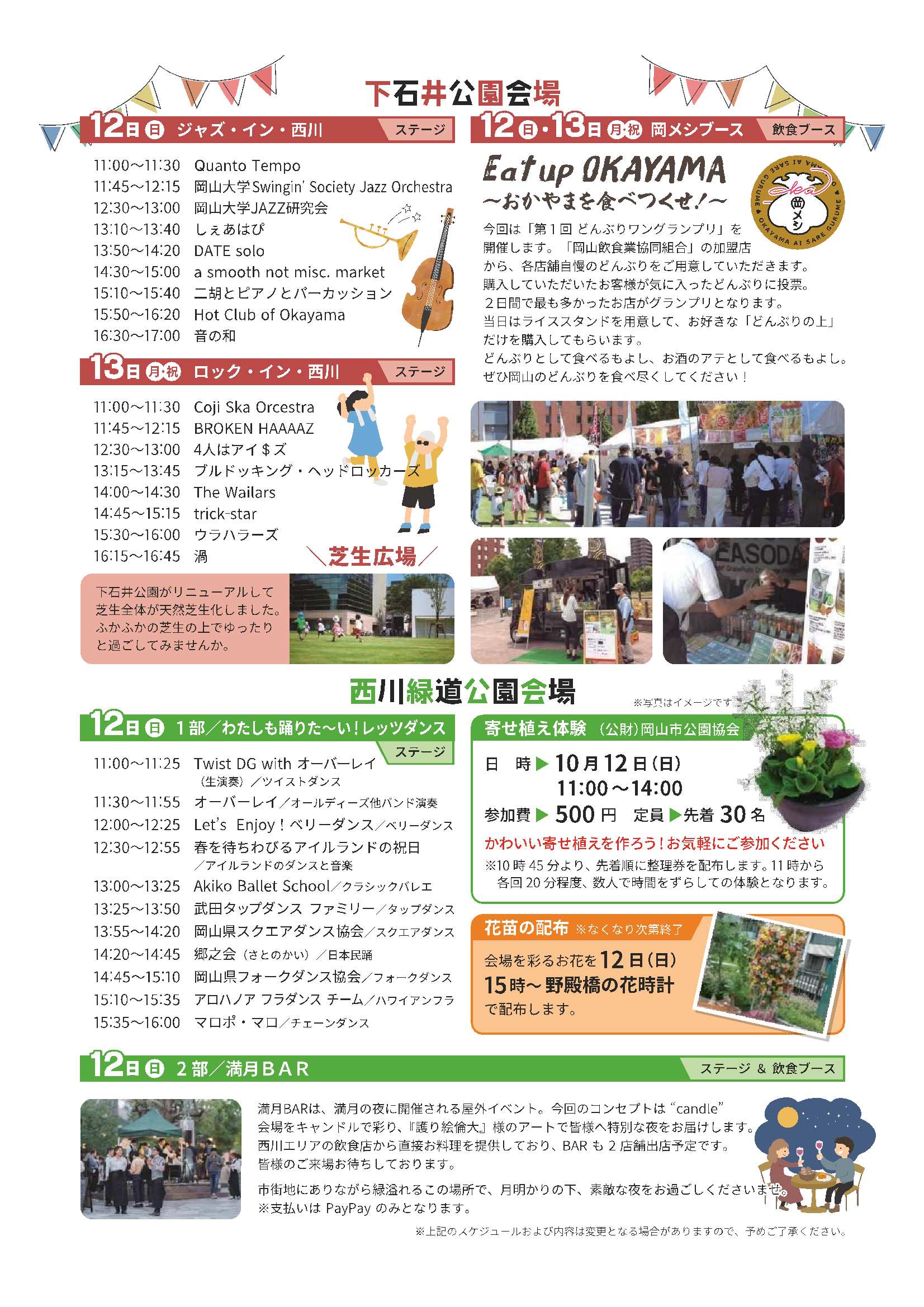 | 第63回 | 令和7年10月12日(日曜日) 午前11時から午後9時 令和7年10月13日(月曜日) 午前11時から午後5時 | 西川緑道公園 下石井公園 | 「わたしも踊りたーい!レッツダンス」のパフォーマンスステージ 「ジャズ・イン・西川」の演奏 「ロック・イン・西川」の演奏 「ぷらっと西川」のフードブース(Eat Up OKAYAMA) 「満月BAR」のフードブース、パフォーマンスステージ 「岡山市公園協会」の寄せ植え体験 など 12日はホコテン!同時開催 |