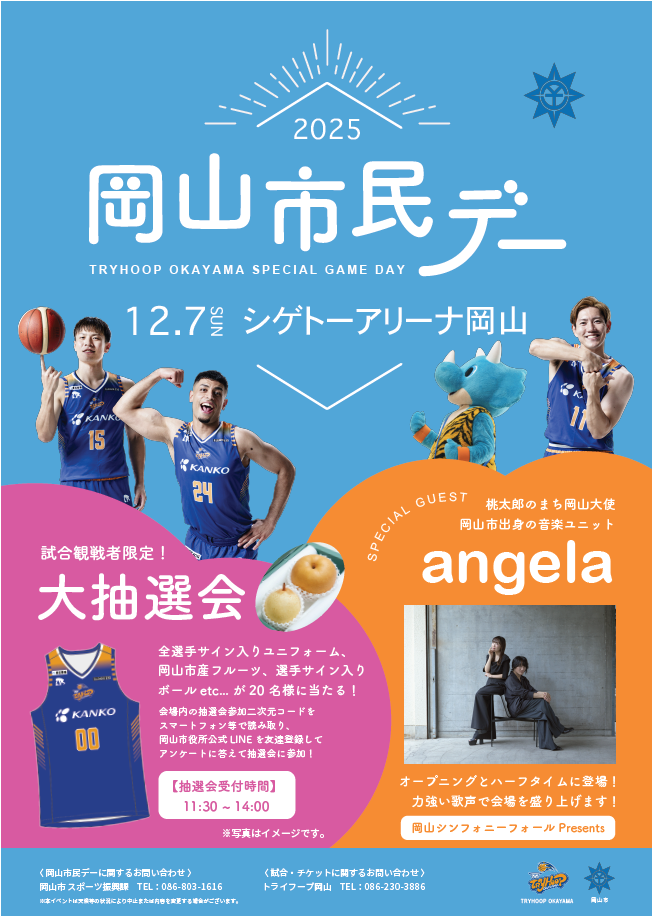 「桃太郎のまち岡山大使」である岡山市出身の2人組アニメソングユニットangela(アンジェラ)と岡山楷の木少年少女合唱団のパフォーマンスがトライフープ岡山のホームゲームを盛り上げます!