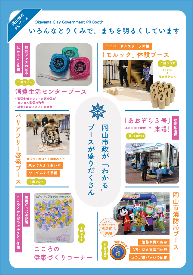| 岡山市消防局ブース | 防火について学ぼう! ・消防車両展示、防火服着用体験など ・マスコットキャラクター桃之介もやって来る! |
