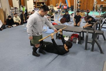 キャンプ初日には、岡山商科大学のウエイトトレーニング部員へ身体の使い方などについて選手からの指導がありました。