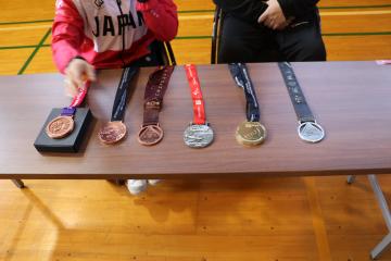 岡山市立平井小学校を訪れ、6年生約120人と交流を行いました。選手とアームレスリング対決をしたり、各種大会のメダルを見せてもらったりしていました。また、応援には、声を出すタイミングと静かにするタイミングがあること、呼吸の大切さや身体の使い方などを学びました。