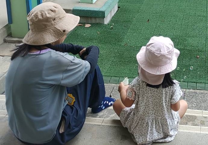 扇風機だけの広場で遊ぶ子どもたちの髪からは、汗が流れ落ちます。