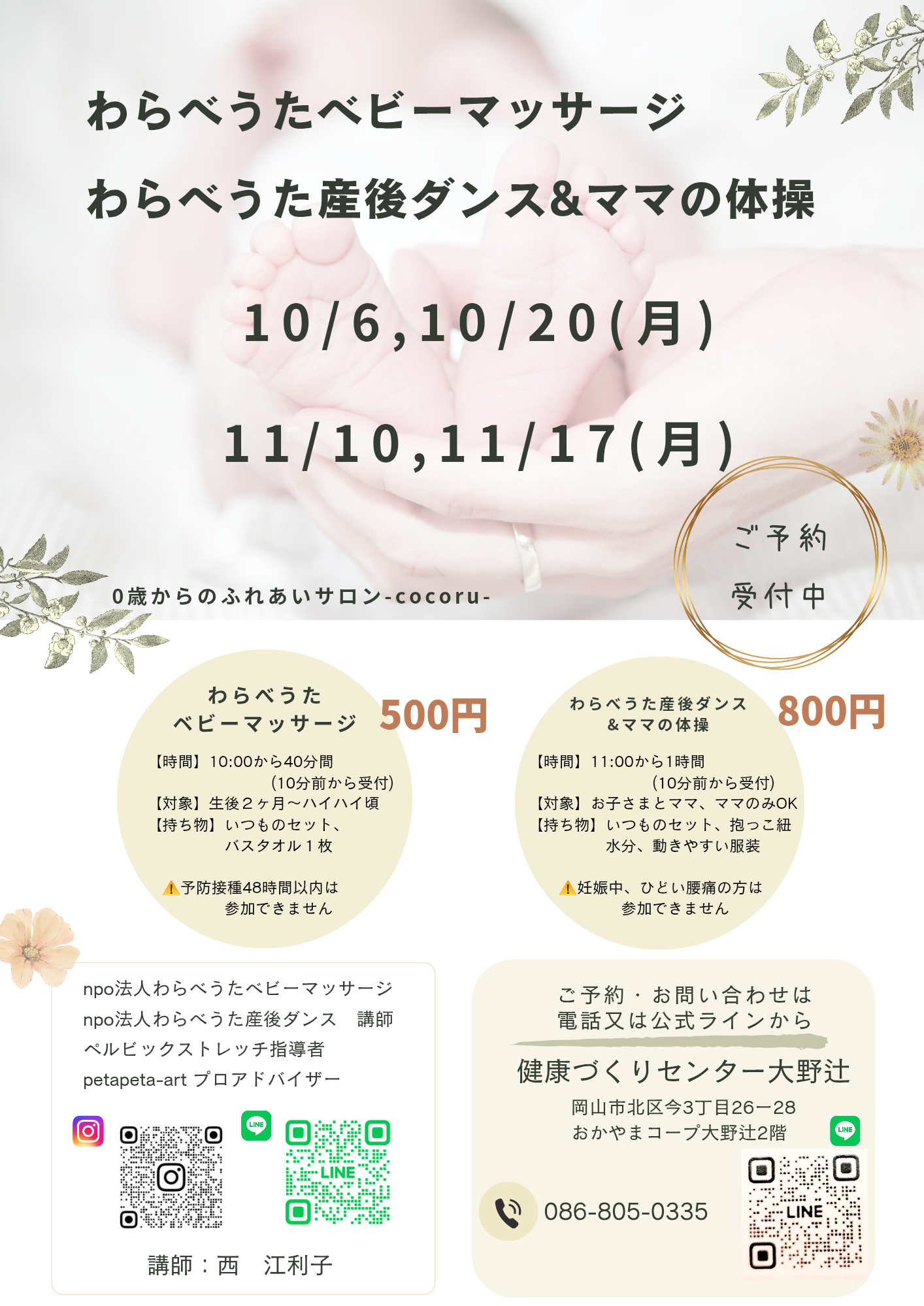 オリジナルのわらべうたの音楽に合わせて服の上からベビーマッサージを行います。