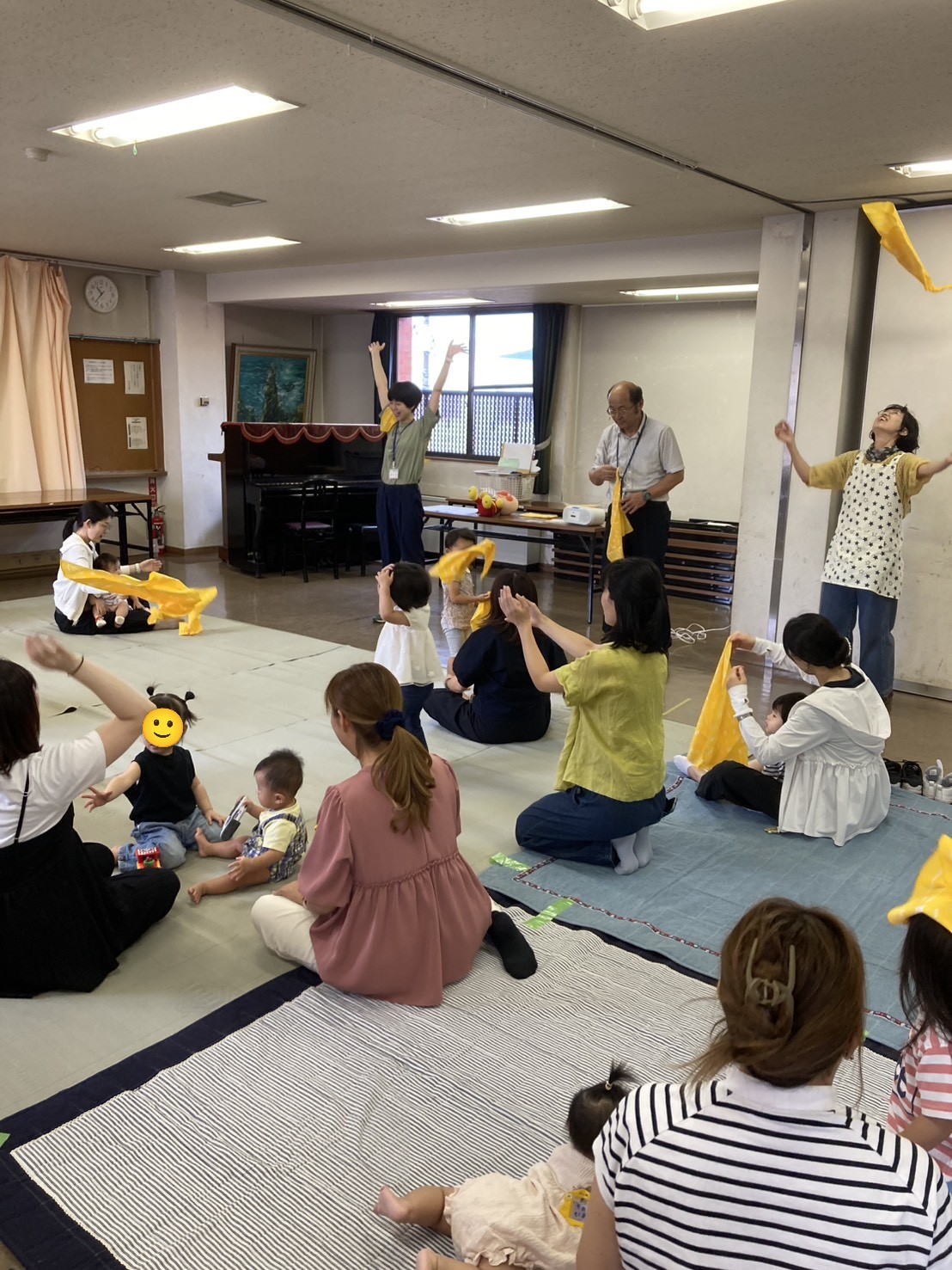 ハンカチ遊びで、いないいないばあや投げ上げ遊びなどをしました。