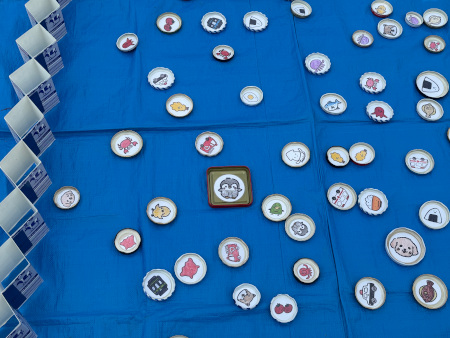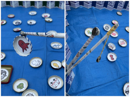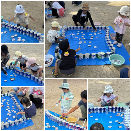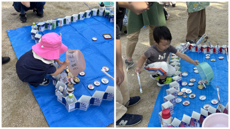 ブルーシートの池に、ビンのフタのお魚(じゃないものも☆)達がたくさん泳いでいます!!ビンのフタは、スタッフが地道に集めました~