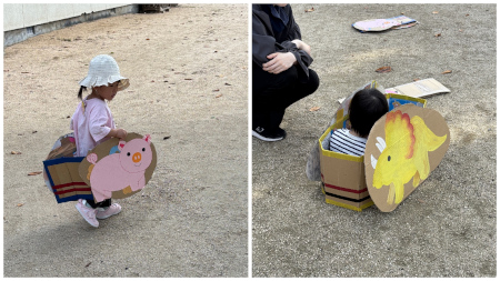 ダンボール車も出しました。歩いたり、おふろみたいに座ったり♪