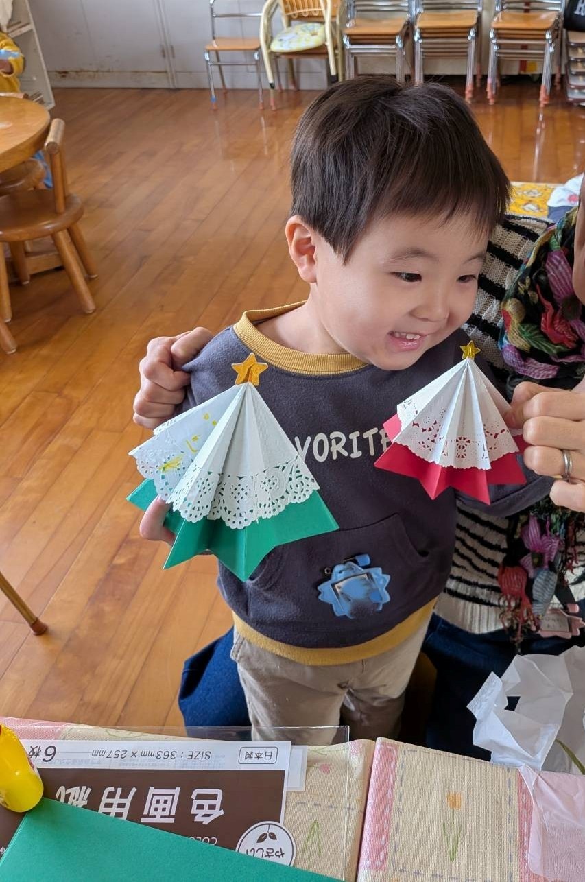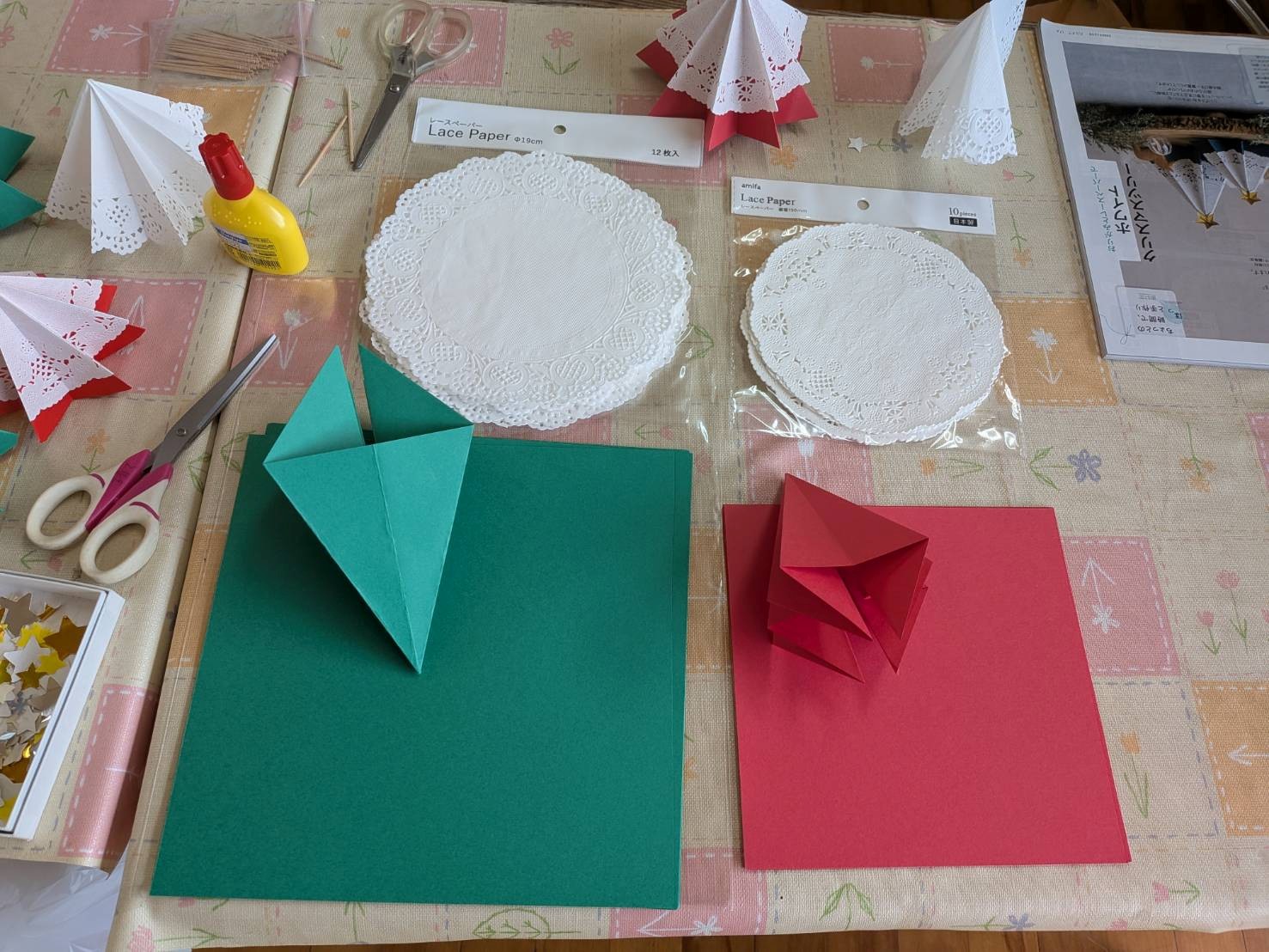 クリスマスカラーの色画用紙を八角形に切って、ツリーのように折るとレースのような紙ナプキンを上からかぶせます。