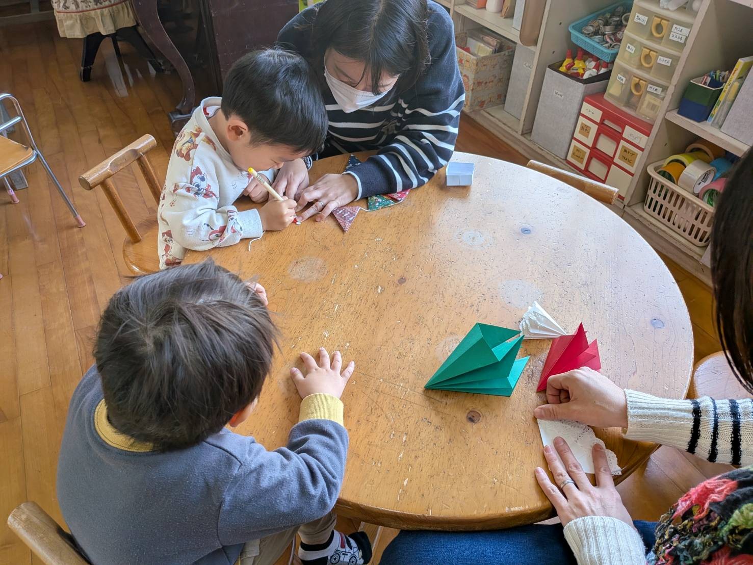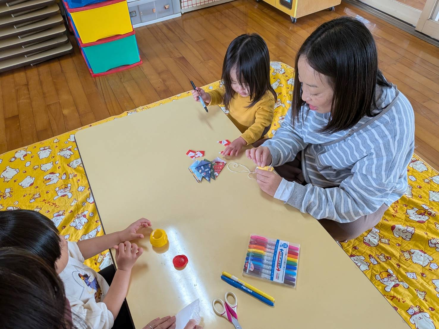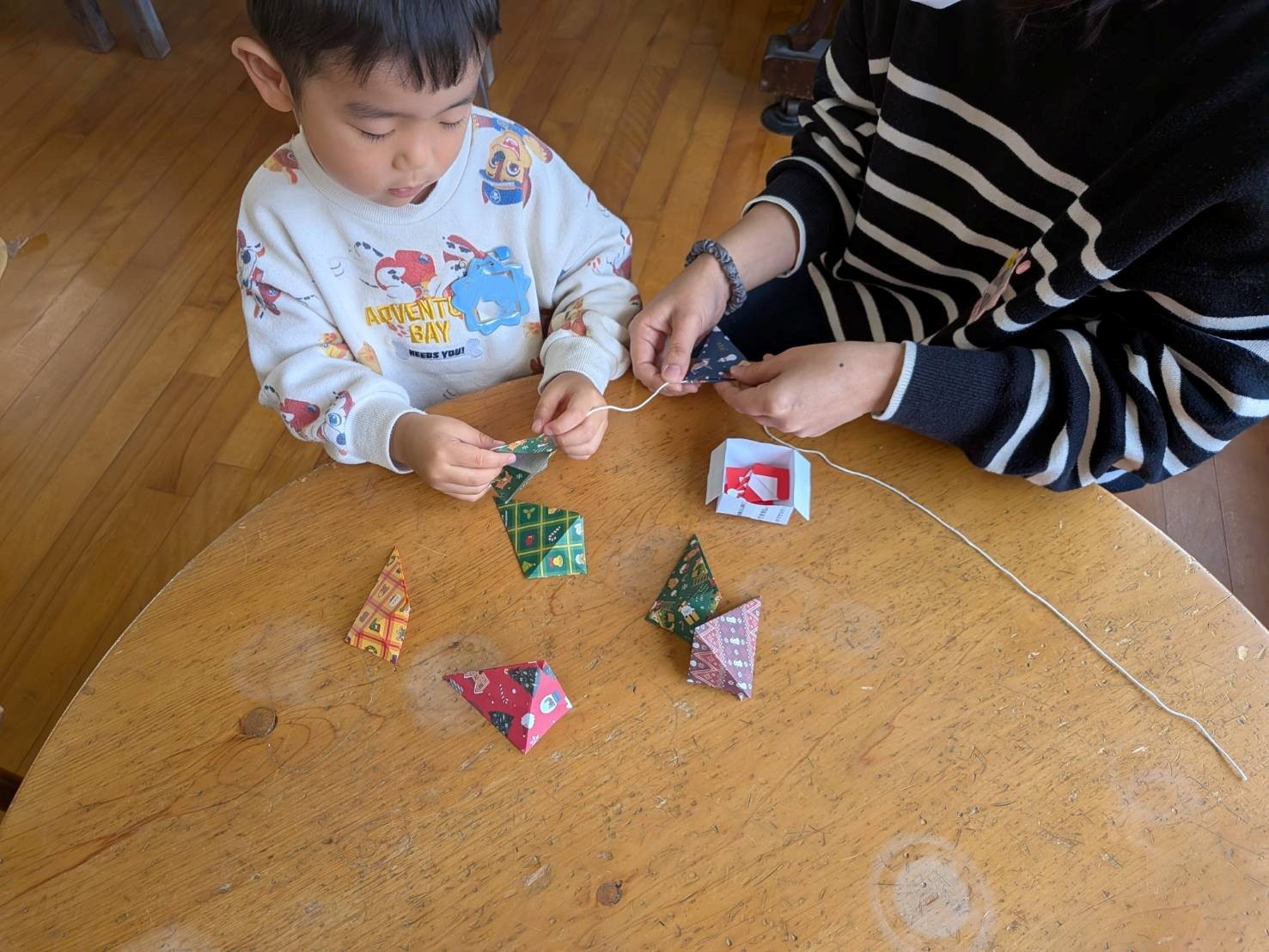 折り紙名人のスタッフが折って用意してくれた三角の折り紙を、タコ糸でつなげてタペストリーのようにしてみました。