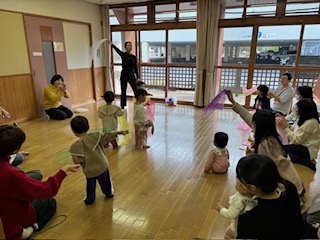 今回は参加者のお母さんがリズムあそびを担当しました。みなさんで盛り上がってくれて大成功でした。新しいことにもどんどん挑戦していきたいです。