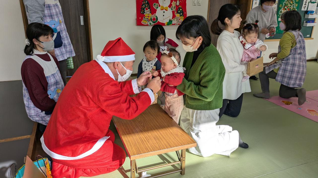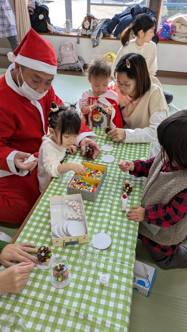 今年もあとわずかになりました先日、お楽しみ会🎄で2学期を締めくくりましたベビーちゃんが多くなって来たため、サンタさんとのふれあい遊びがメインになりました✨不思議と泣き出す子は居なくて楽しく過ごせましたまつぼっくりツリーの製作や、音楽に合わせて鈴を鳴らしたり、大型絵本、スタッフ手作りのエプロンシアターなどで楽しみましたサンタさんからのプレゼントもありましたよ😊来年の開催予定日は、1月7日(水曜日)です
