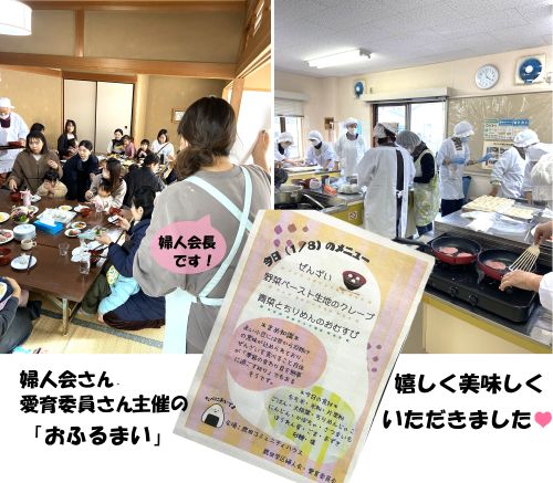 婦人会と愛育委員の皆さんの「おふるまい」に預かりました。心のこもった手料理に舌鼓をうち、ほっこり幸せな時間を過ごすことができました。