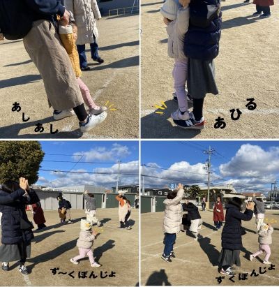 出来あがったら園庭に出て、のびのび外遊び。今日は室外にもわらべ歌遊びコーナーがあります。わらべ歌に合わせて、足のせ歩きやつくしの行進、ご挨拶ごっこなど、体を動かして遊びました。