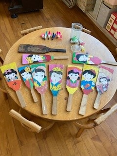 折り紙で作ったコマを回してみたり、雪だるまのふくわらいやスタッフが持参した昔ながらの羽子板で羽根つきをしてみたり、見て・触って・親子で一緒に楽しんでもらいました。