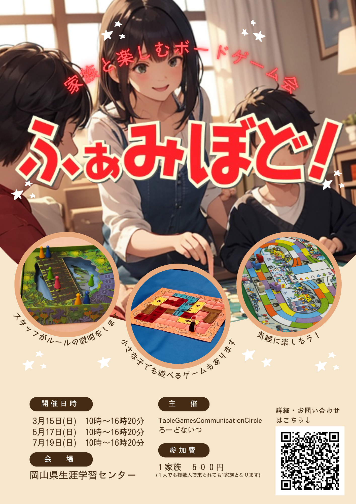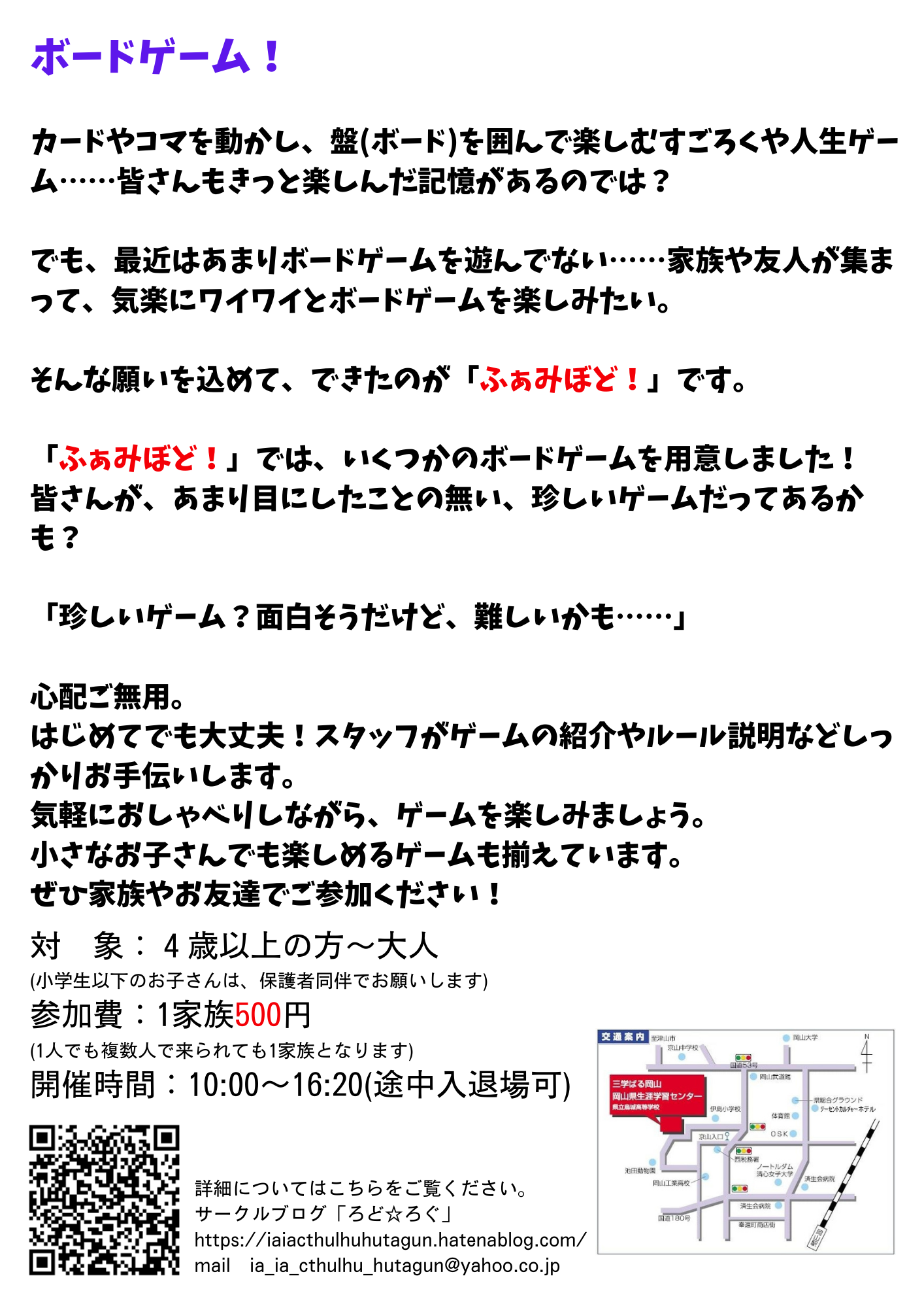 参加費:1家族500円(1人でも複数人で来られても1家族となります)