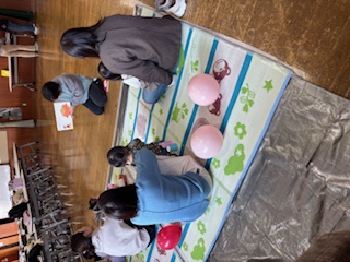 今日はバレンタインを意識して風船も工作もピンク色を用意しました。子どもたちの遊びはいつもと一緒ですが、雰囲気は華やかになりました。