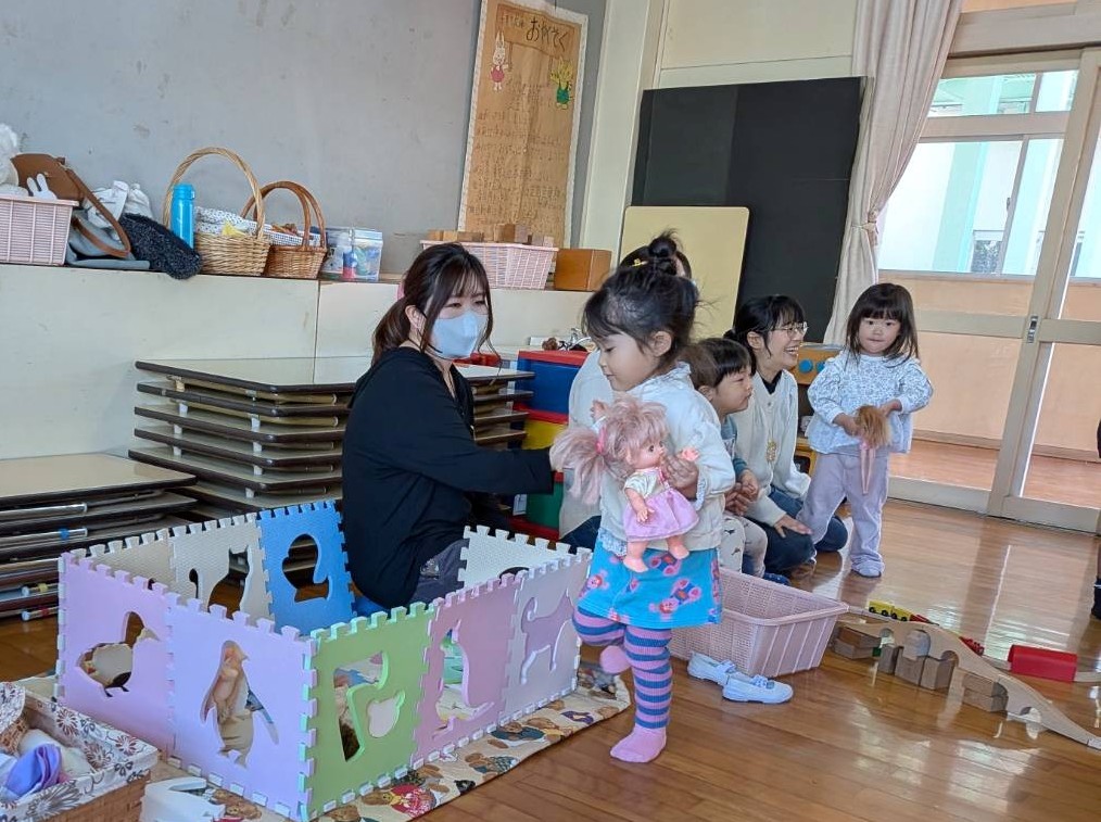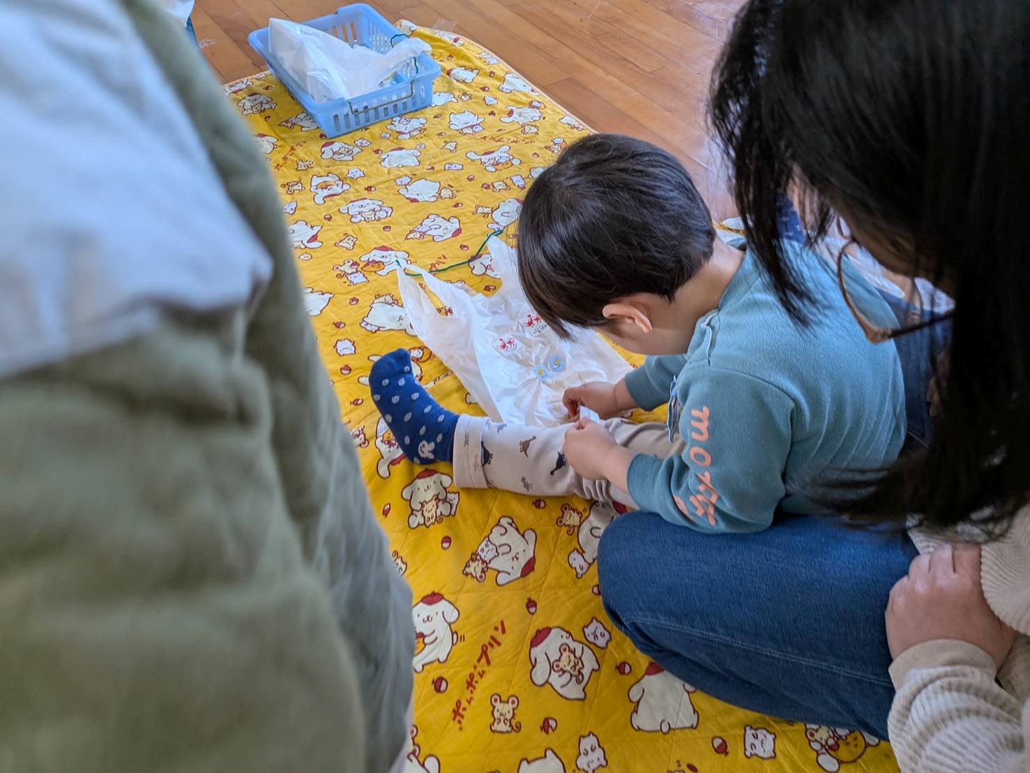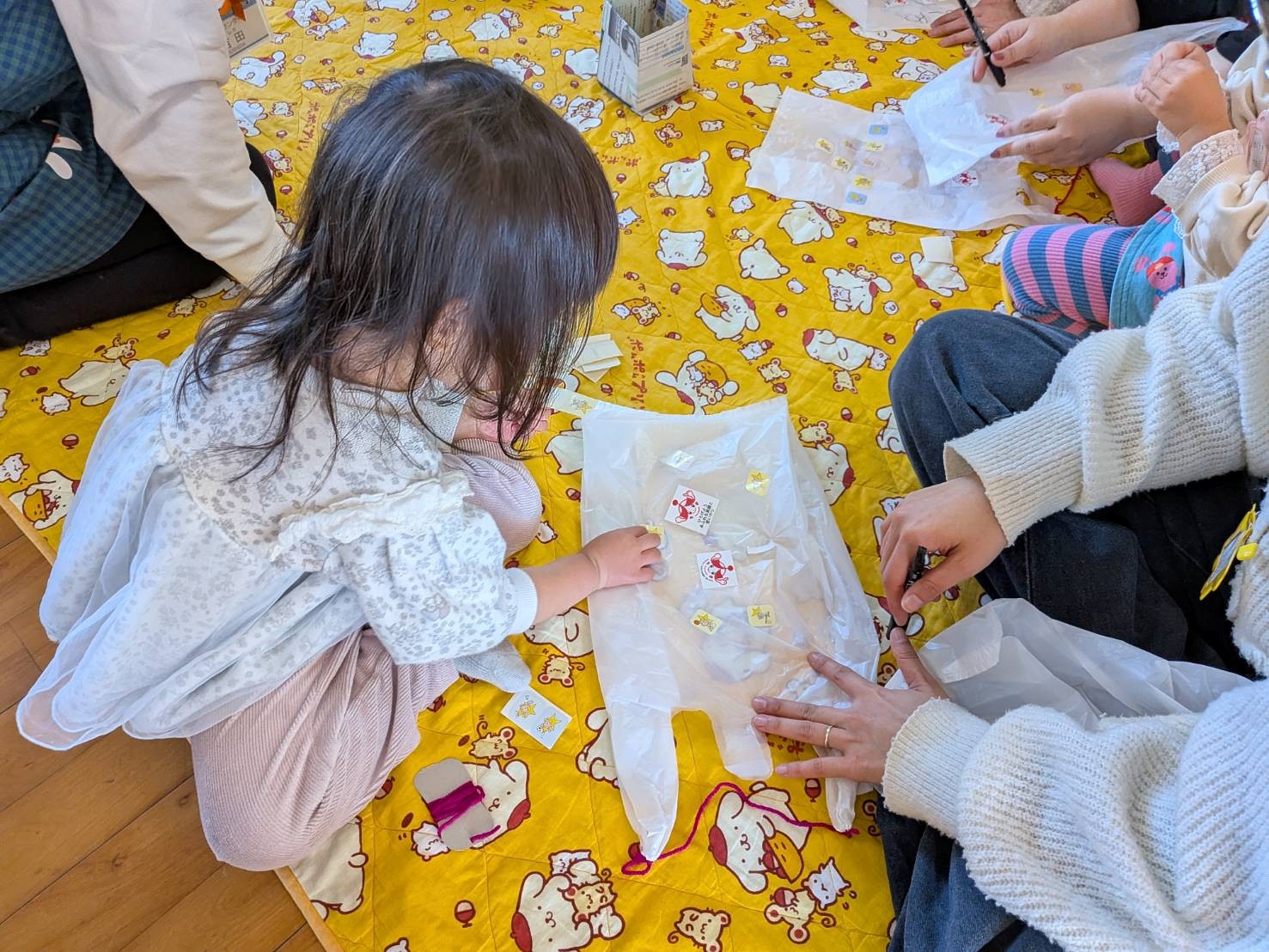 最初はお母さんのそばで少し様子を見ていましたが、遊びが始まると自然と輪の中へ。