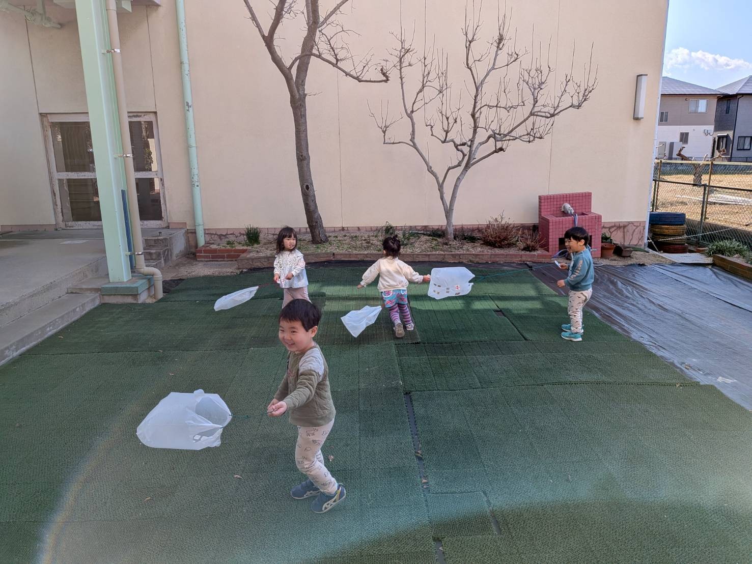 「わあ、あがった!」と元気いっぱい、風に舞う凧を手に走り回っていました。
