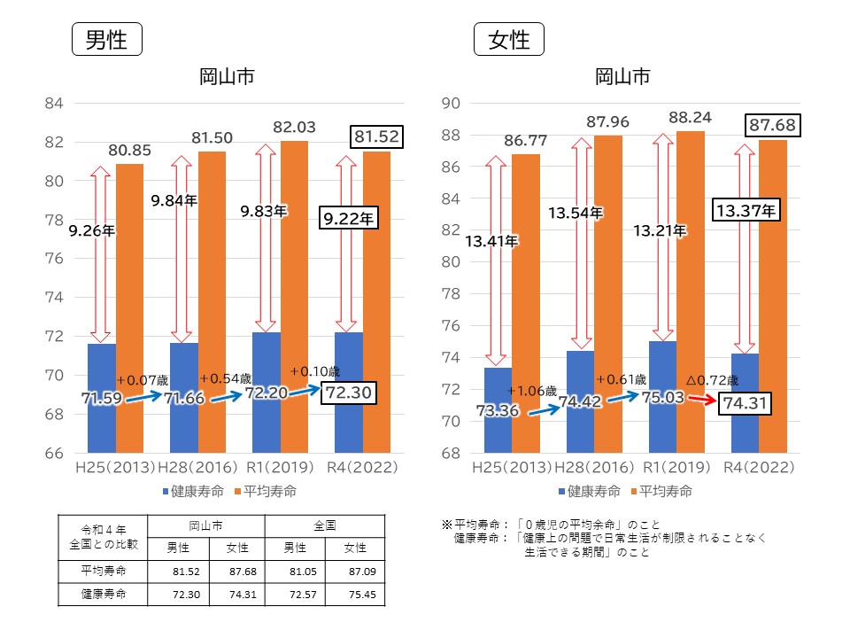 岡山市の健康寿命は令和4年時点で、男性が72.30歳、女性が74.31歳となっており、平成25年からの約10年で男性は0.71歳、女性は0.95歳伸びています。