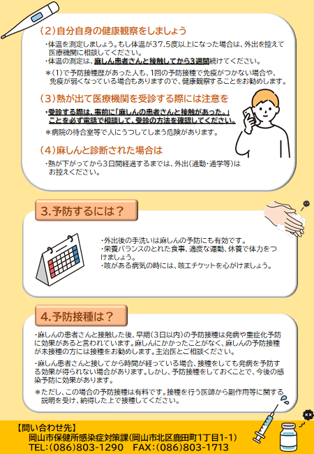 麻しん、およびその疑い患者を診断された場合、直ちに岡山市保健所感染症対策課までご連絡ください。(086-803-1262)