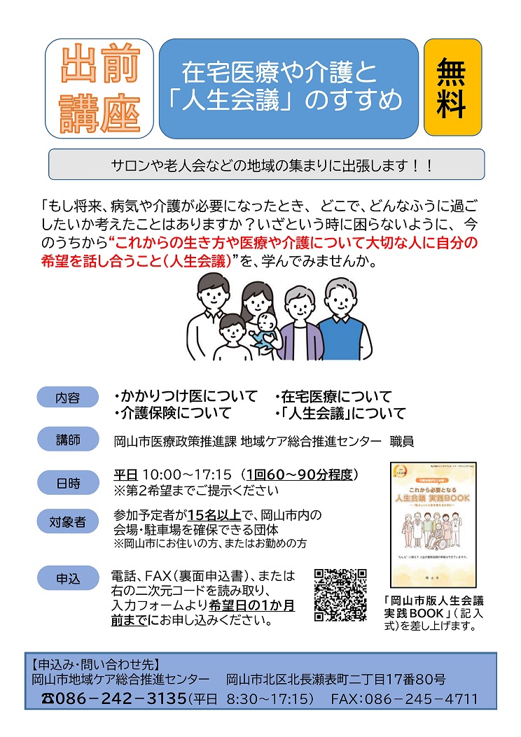 平成25年度から、岡山市における在宅医療・介護の普及啓発のため、市職員が地域の公民館や集会所、企業等に出向いて講座を開催しています。