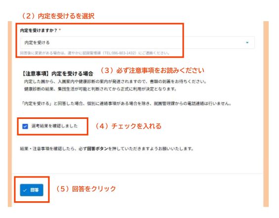 - 画面の(2)で「内定を受ける」を選択する。