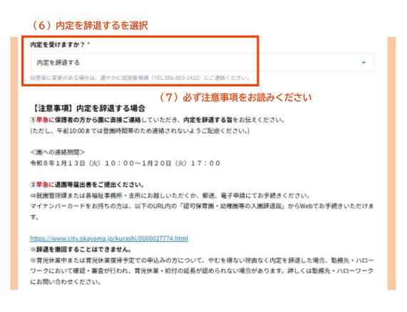 - 画面の(6)で「内定を辞退する」を選択する。