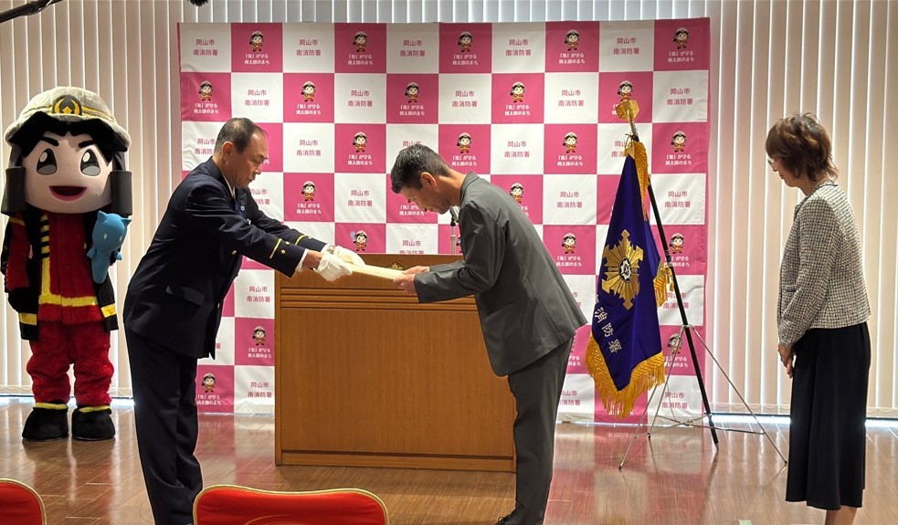 岡山市南区でテニスのレッスン中、心臓が止まり突然倒れた受講生に、近くにいた仲間とコーチがAEDを使って応急手当を実施し、素早い手当と通報により、その場で意識が回復、社会復帰する事ができました。その功績を称え、南消防署で感謝状を贈呈しました。
