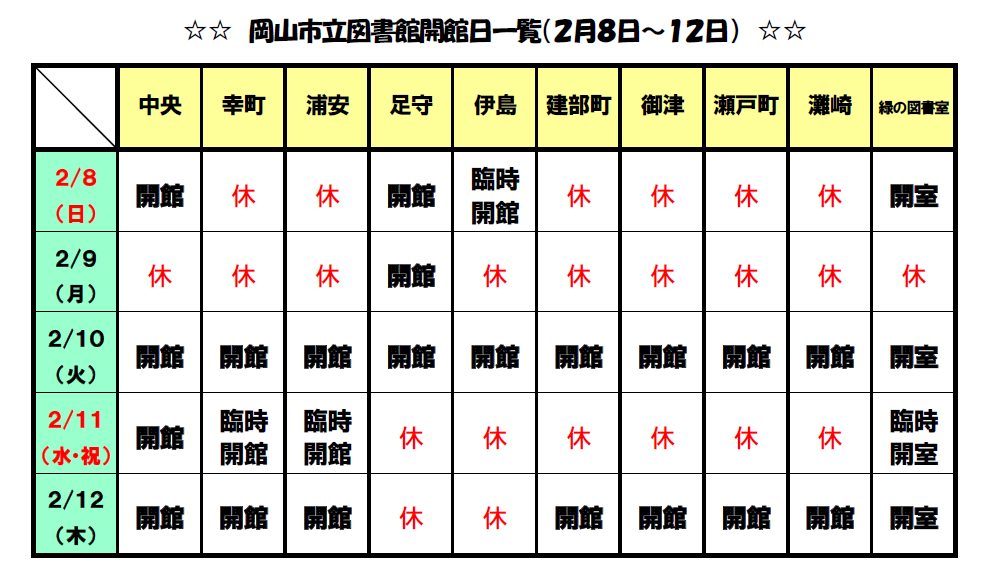 ※2月11日(水曜日・祝日)は臨時開室