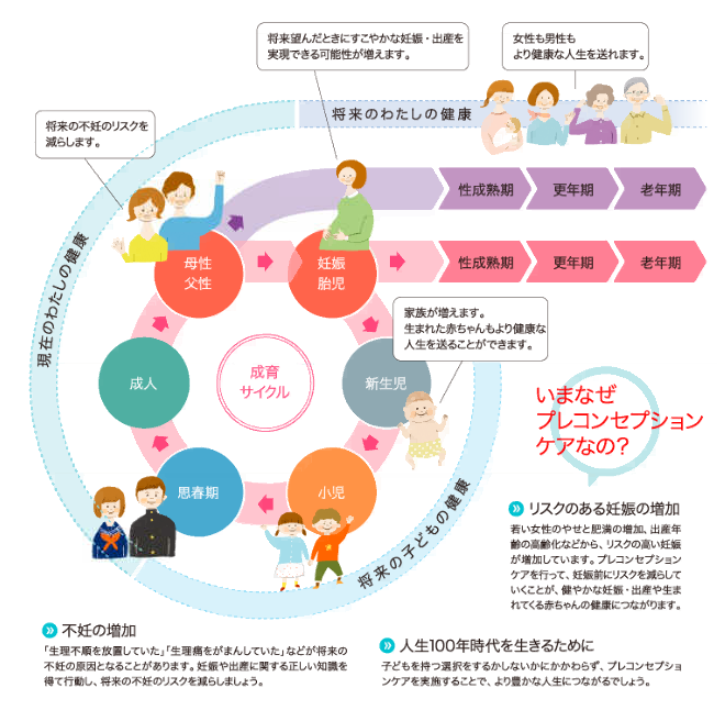 つまり、プレコンセプションケアは、「若い男女が将来のライフプランを考えて、日々の生活や健康に向き合うこと」で、次世代を担う子どもの健康にもつながるとして、近年注目されているヘルスケアです。