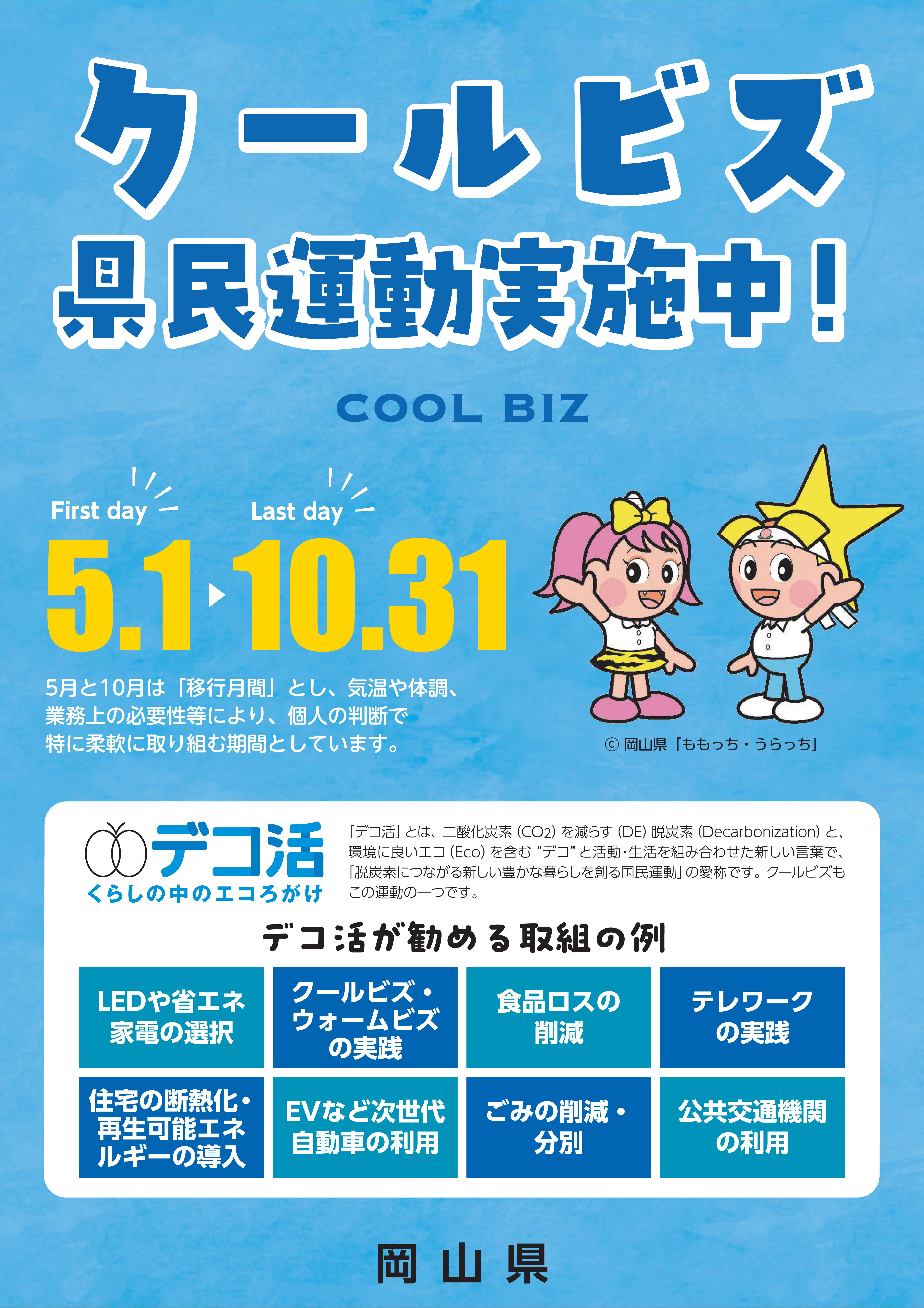 また、期間中は、岡山県下において「クールビズ県民運動」を実施しています。市民・事業者の皆様もご家庭や事業所において、無理のない範囲で、「クールビズ」を心がけましょう!