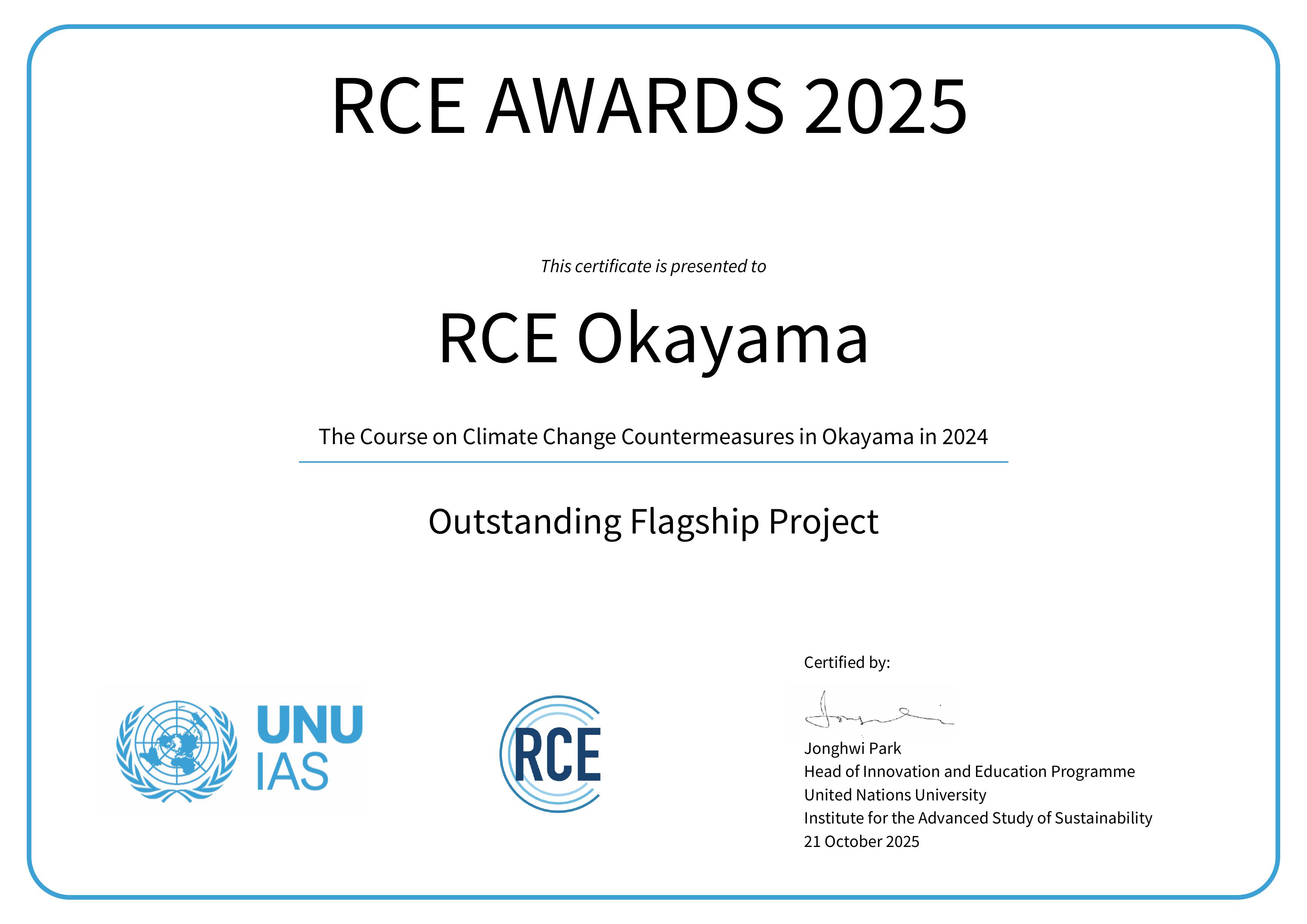 RCE岡山(岡山ESD推進協議会)が応募した岡山市の取組「気候変動対策おかやま塾」(ゼロカーボン推進課)が「RCEアワード2025」最優秀賞(Outstanding