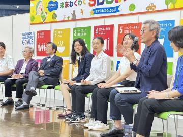 ステージのラストは、SDGsの達成年限である2030年のその先を考えるパネルトーク「みんなで創ろう!ビヨンドSDGs」。大学・行政・経済界の関係者と高校生・大学生が登壇し、「ワクワクする社会」、「健やかさと美しさ」、「共に生きる」、「地球を一つと捉える心」など、「ビヨンドSDGs」をテーマに未来への多様なキーワードを発表。また、岡山版のビヨンドSDGsとして、自然と人間の共生、人間同士の共生に基づくウェルビーイング社会の創生を目指す「SWGs(Shared Well-being Goals:共生ウェルビーイング目標)」が提案されました。