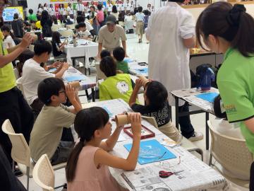 また、ペットボトルキャップを細かく砕いて色ごとに分けた素材を使ったキャップアートや、段ボールを活用した財布づくりなど、普段は捨ててしまいがちな素材を夏休みの思い出を彩る作品へとアップサイクルする体験も行われていました。