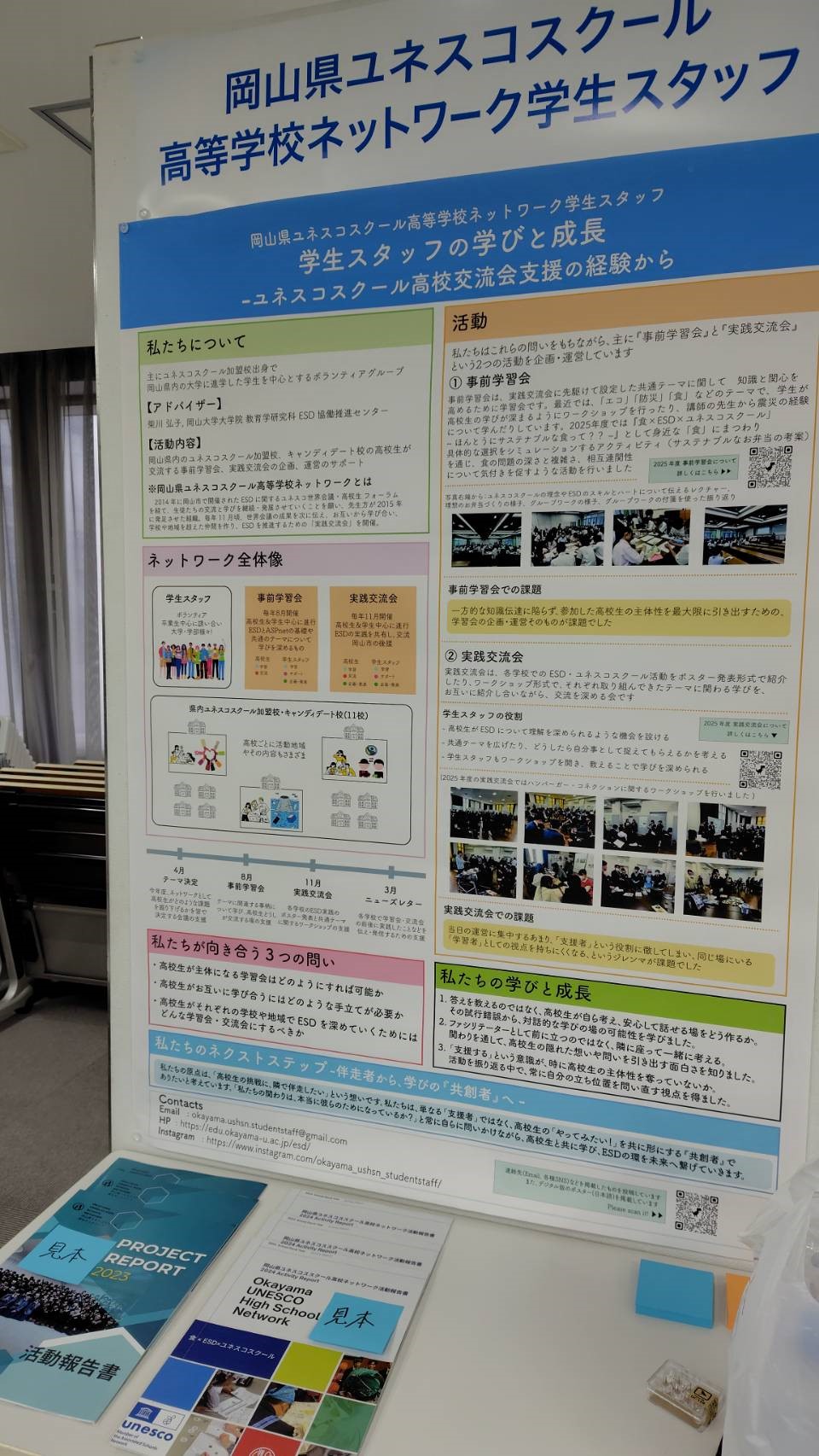 今回のポスターセッションでは、様々な年代・バックグラウンドを持った方々から興味を持っていただくことができました。複数のユネスコスクール加盟校を大学がハブとなって繋ぎ、まとめている体制を評価いただいたほか、我々が行っているイベント(事前学習会・実践交流会)のような学びを深めたり、つながりを作ったりする機会がないという高校生の声も聴かれました。まさに、個別の学校を飛び出した「地域」にこのような場を作っていることの重要性と意義を再認識した次第です。