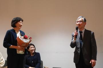 最後に、岡山ESD推進協議会の阿部会長より、「岡山市は新しい総合計画にもESDを大きく取り入れている。人々のコミュニケーションとコミュニティを大切にする意識が、課題解決の鍵と考える。住民一人ひとりが意識を持って議論する場を作ることが重要で、公民館は非常に大切な役割を担っている」と岡山市のESD・SDGs推進における課題と展望が述べられました。その後、岡山ESD推進協議会20周年を記念し、長年、会長を務められた阿部さんへ感謝の言葉と花束が贈呈され、ESDカフェを終了しました。