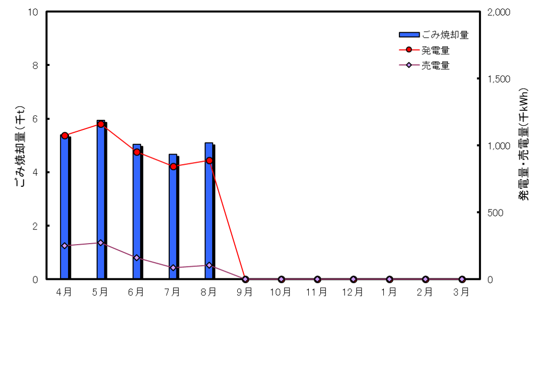 | ごみ焼却量(単位:t) | 発電量(単位:kWh) | 売電量(単位:kWh) | |