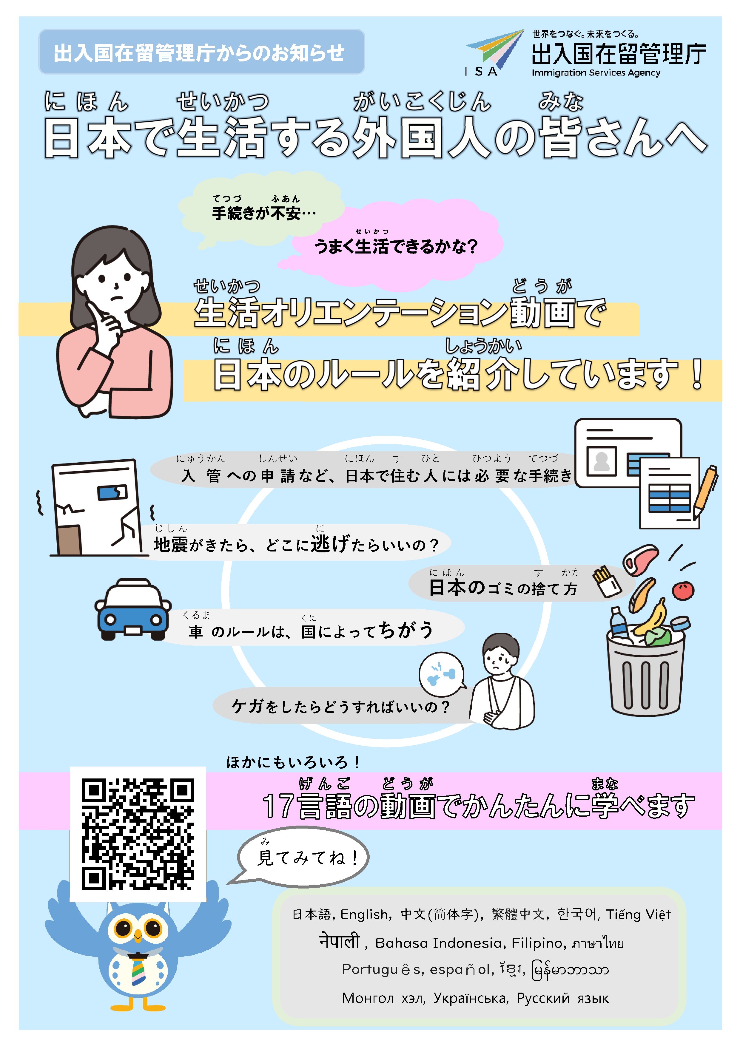 この動画では、生活上のルールや仕事、税金など、日本での生活に必要な基本的な情報やルールを17言語で紹介しています。