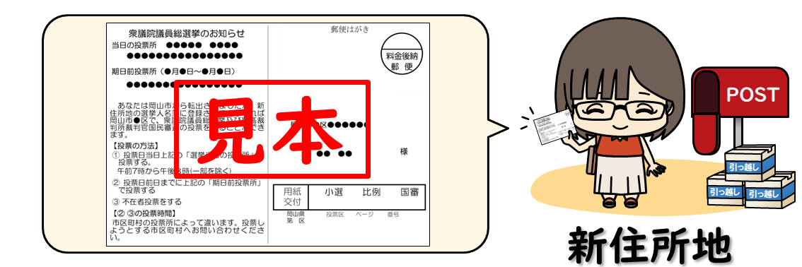 旧住所地の岡山市で投票できる転出者の方の元には、岡山市から「投票のお知らせ」が届きます。