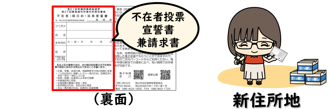 (注意)旧住所地の岡山市で投票するためには、転出前の岡山市に3カ月以上住んでいて、岡山市の選挙人名簿に登録されている必要があります。