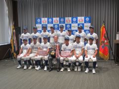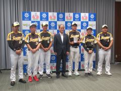 第33回ヤングリーグ選手権大会で優勝したオール岡山ヤングの選手・関係者が、大森雅夫岡山市長を表敬訪問しました。