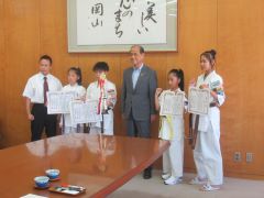 第1回国際グランドチャンピオン決定戦少年少女空手道選手権大会で優秀な成績を収めた選手・関係者が、大森雅夫岡山市長を表敬訪問しました。