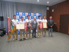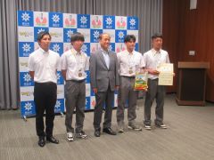 インターハイの自転車競技で優勝した岡山工業高等学校自転車競技部及びローイング競技で優勝した関西高等学校ボート部の選手・関係者が、大森雅夫岡山市長を表敬訪問しました。