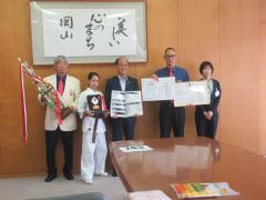 空手の大会で優秀な成績を収めた井上達二選手及び石原希々選手並びに関係者が、大森雅夫岡山市長を表敬訪問しました。
