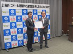 岡山市とALSOK株式会社との「災害時における避難所の運営支援等に関する協定」の締結式が行われ、大森雅夫岡山市長が出席しました。