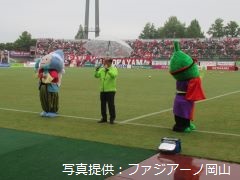 「ヘイトスピーチをなくそう」の啓発活動がファジアーノ岡山ホームゲームにあわせて行われ、大森雅夫岡山市長が参加しました。