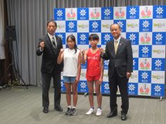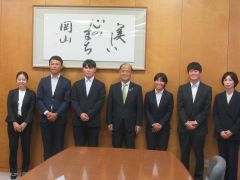 日清食品カップ第41回全国小学生陸上競技交流大会に出場する羽原大翔、石井菫両選手及び関係者が、大森雅夫岡山市長を表敬訪問しました。