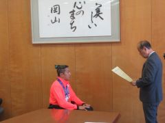 2025世界パラ陸上競技選手権大会T52クラスの男子400mと1500mで金メダル、100mで銀メダルを獲得した佐藤友祈選手の偉業を讃え、大森雅夫岡山市長から「特別スポーツ栄誉賞」を授与しました。