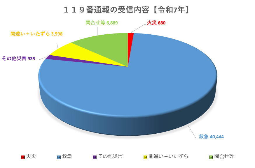 火災680件、救急40,444件、その他災害935件、間違い及びいたずら3,598件、問合せ等6,889件